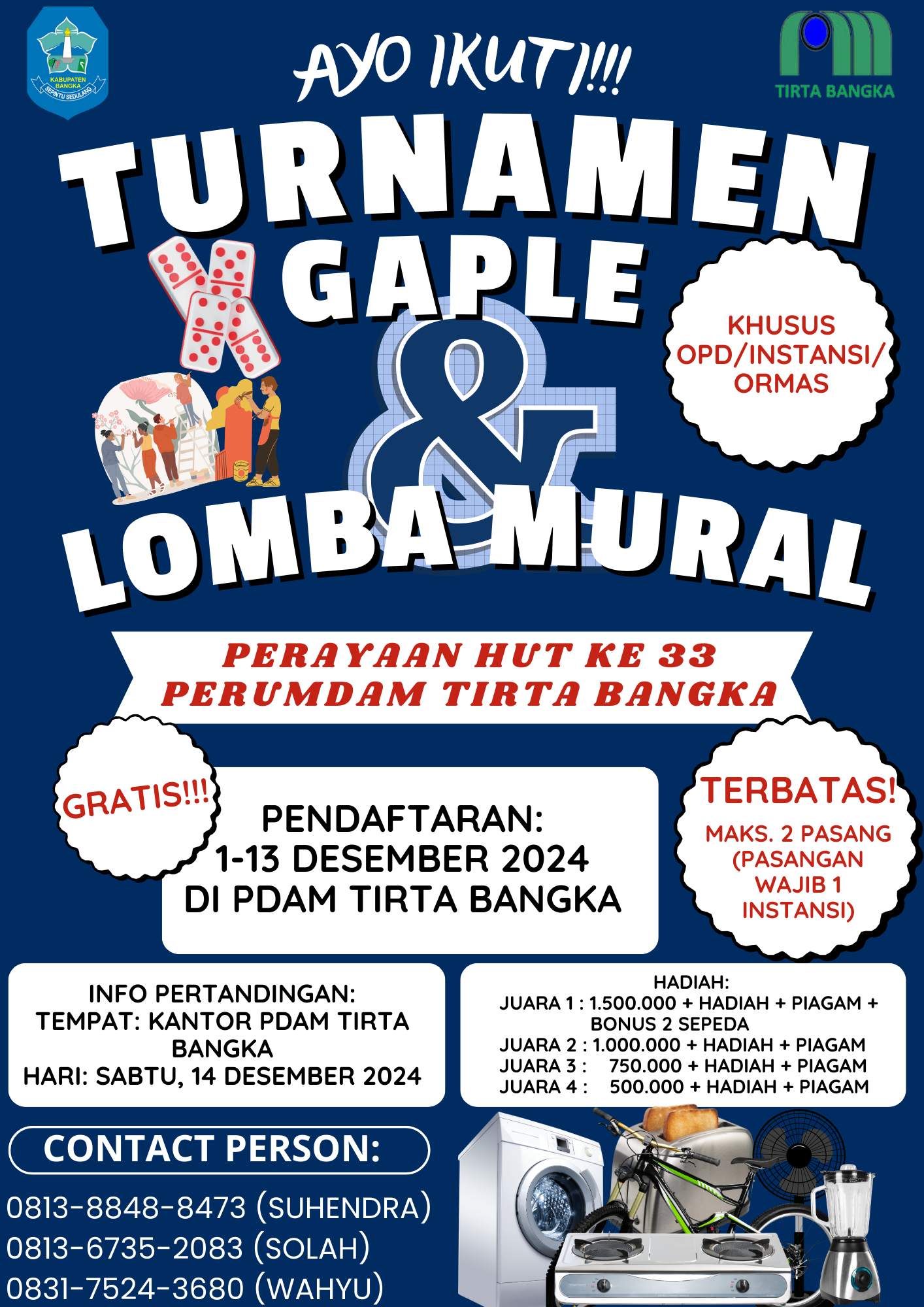 Sungailiat, orcabroadnews.comΒ β Dalam upaya memeriahkan Hari Ulang Tahun (HUT) yang ke-33, Perumdam Tirta Bangka (PDAM) akan mengelar turnamen Gaple dan lomba Mural. Selain itu diadakan perlombaan yg bersifat internal dan pemberian penghargaan bagi pelanggan.