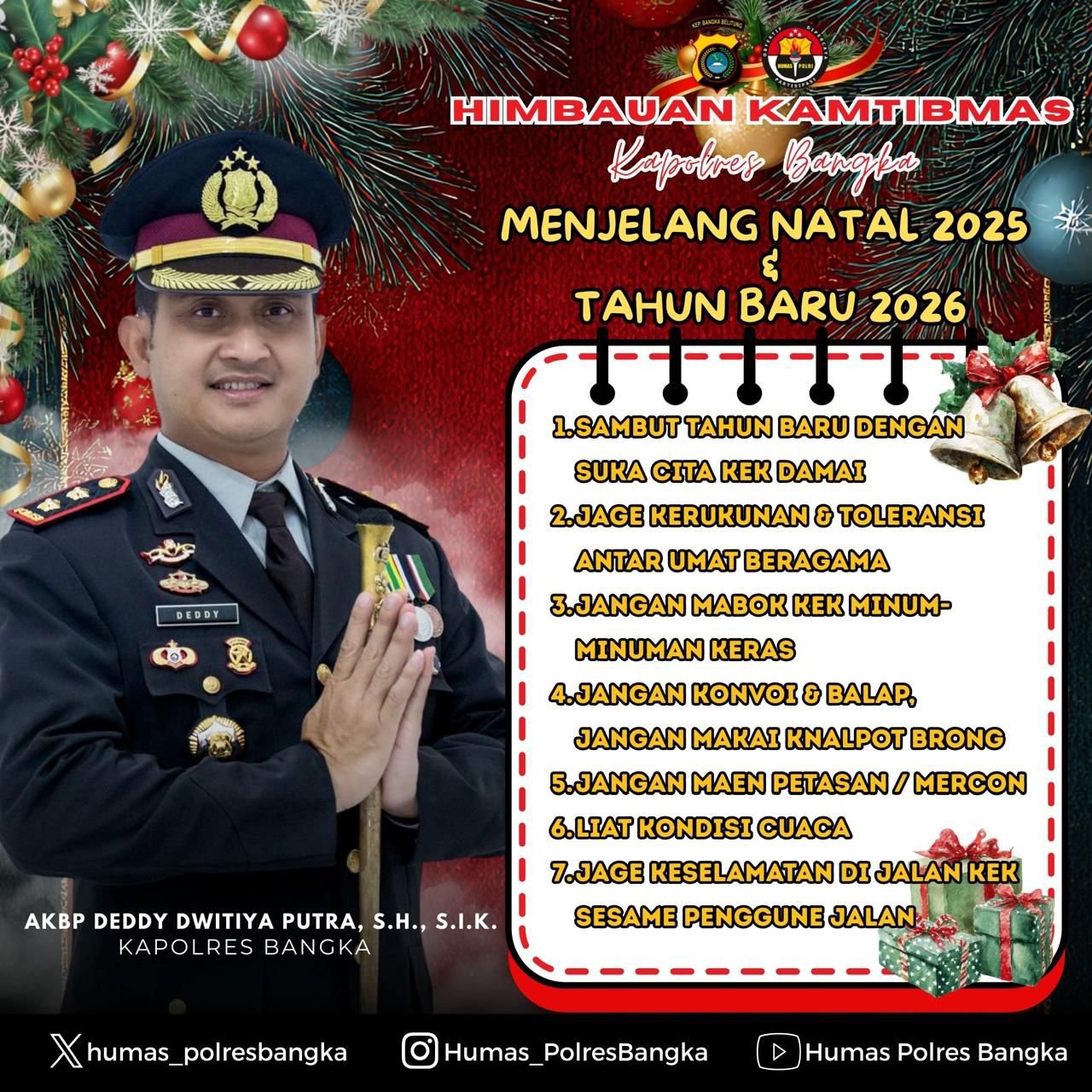 OrcaNews Bangka,Sungailiat β Menjelang perayaan Hari Raya Natal 2025 dan pergantian Tahun Baru 2026, Kapolres Bangka AKBP Deddy Dwitiya Putra, S.H., S.I.K. mengimbau seluruh masyarakat Kabupaten Bangka untuk bersama-sama menjaga situasi keamanan dan ketertiban masyarakat (kamtibmas) agar tetap aman, damai, dan kondusif. Sabtu (20/12/2025)