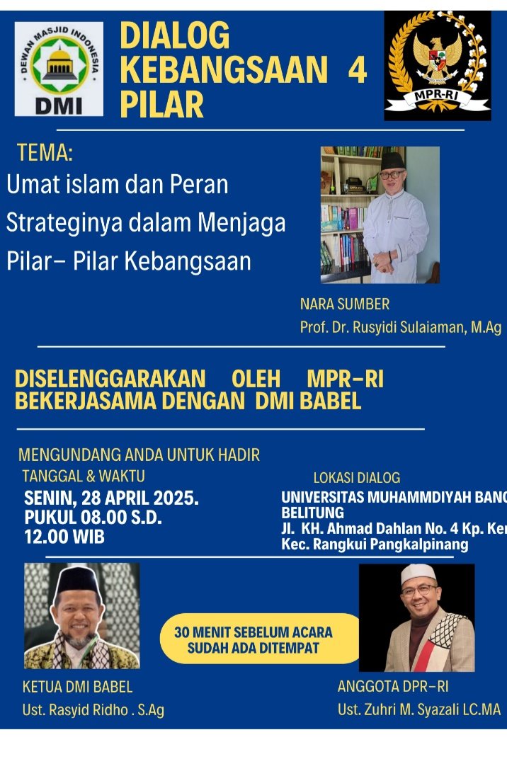 OrcaNews Bangka Belitung – Majelis Permusyawaratan Rakyat Republik Indonesia (MPR RI) bersama Dewan Masjid Indonesia (DMI) Provinsi Kepulauan Bangka Belitung menggelar sosialisasi Empat Pilar Kebangsaan, Senin (28/4/2025). Kegiatan ini berlangsung di Auditorium Universitas Muhammadiyah Bangka Belitung, dari pukul 08.30 hingga 12.00 WIB.