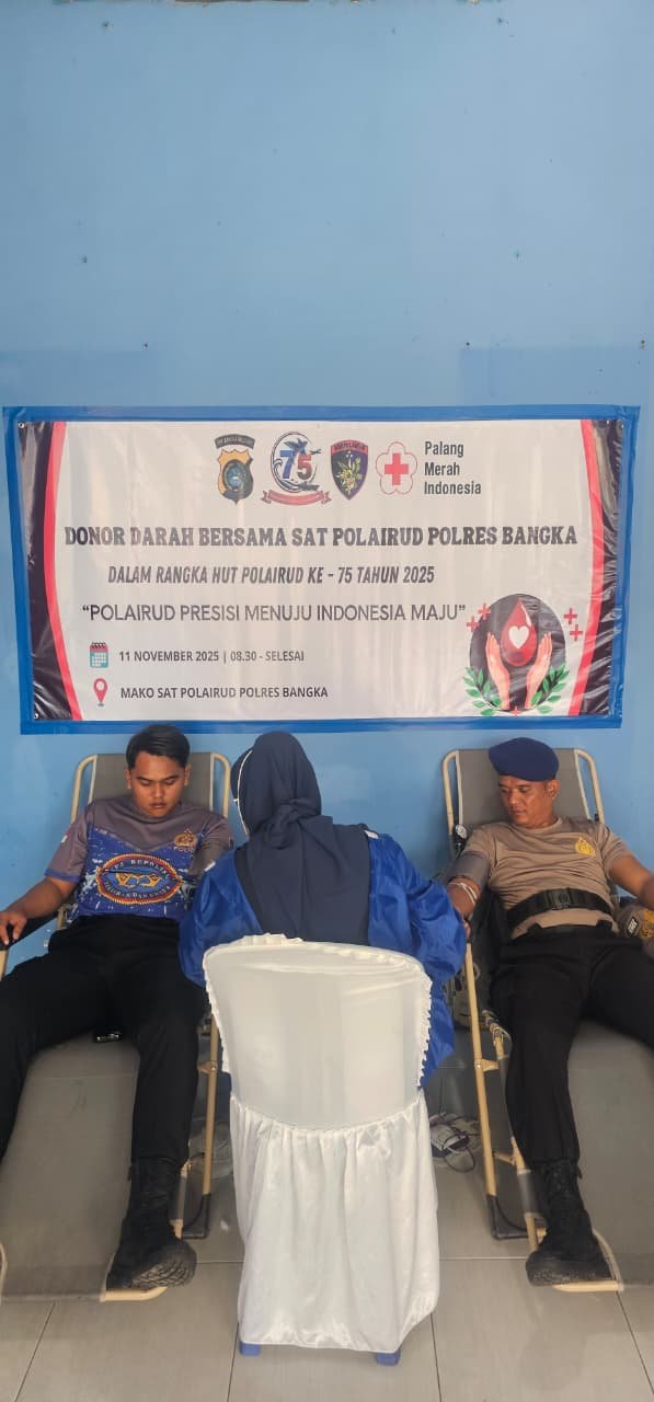 OrcaNews Bangka β Satuan Polisi Air dan Udara (Sat Polairud) Polres Bangka menggelar kegiatan donor darah dalam rangka memperingati Hari Ulang Tahun (HUT) Polairud ke-75 tahun 2025 dengan tema βPolairud Presisi Menuju Indonesia Majuβ. Kegiatan berlangsung di Mako Sat Polairud Polres Bangka, Selasa (11/11/2025) pagi.