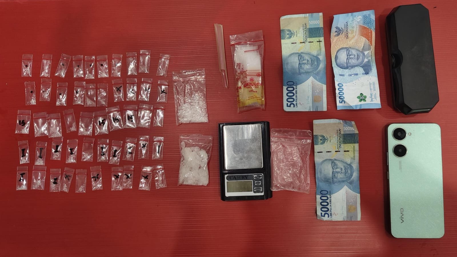 Adapun barang bukti yang berhasil diamankan antara lain 50 paket kecil sabu, 2 paket sedang sabu, plastik klip kosong, satu unit handphone, timbangan digital, alat bantu berupa sedotan yang dimodifikasi, kotak penyimpanan, serta uang tunai sebesar Rp150 ribu. Total berat bruto sabu yang diamankan mencapai 20,16 gram.